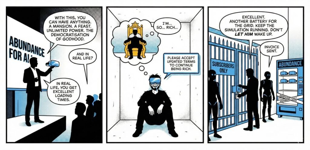 • Pretending abundance arrives without changing ownership, while everything else in history arrived with an invoice.