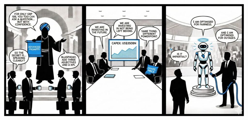 Panel: A robed “Prompt Guru” sells scrolls labelled “ADVANCED PROMPTS” to office workers holding empty mugs.