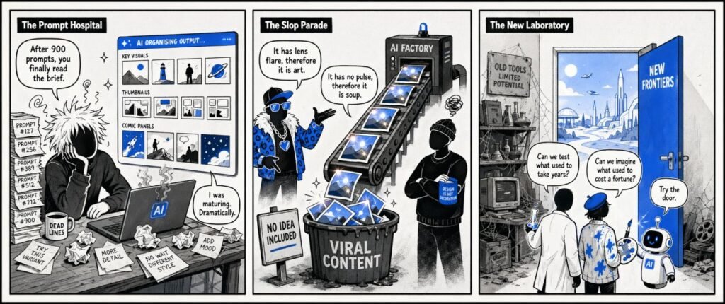 Keep. Keep AI as a creative assistant, research engine, design sparring partner, and laboratory torch. Toss the lazy slop, the magic-god nonsense, and the panic merchants selling fear because their old gate has lost its lock.