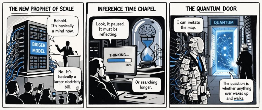 Scene 3: “The Quantum Door” Panel description + dialogue: At the end of a grey corridor of GPUs, a small glowing quantum chamber stands half open, while the old machine stares at it from the dark. Machine: “I can imitate the map.” Hermit: “The question is whether anything ever wakes up and walks.”