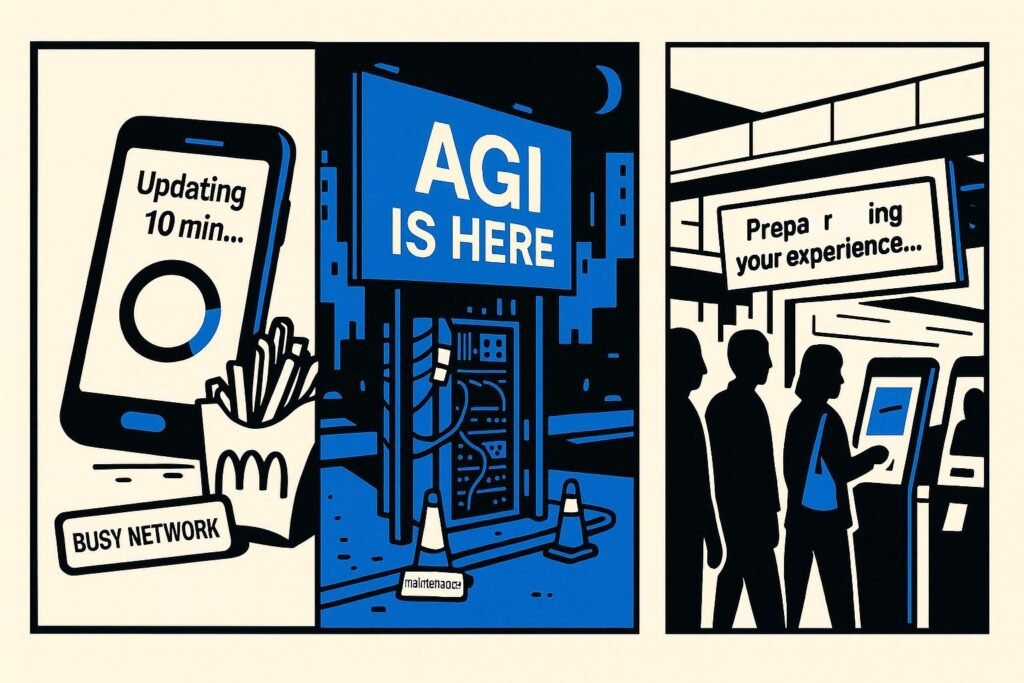 - Scene two: Billboard says “AGI is here.” Behind it, servers held together with tape.