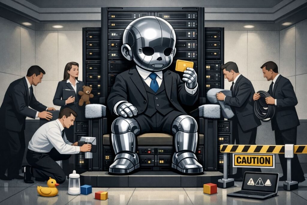 Scene 1: The Nursery of the Future Panel description: A glossy tech launch. A giant chrome robot stands on stage in a tiny school blazer while executives clap beneath a banner reading “AUTONOMY”. Dialogue: “We have built the digital adult.” “It just asked where the save button lives.”