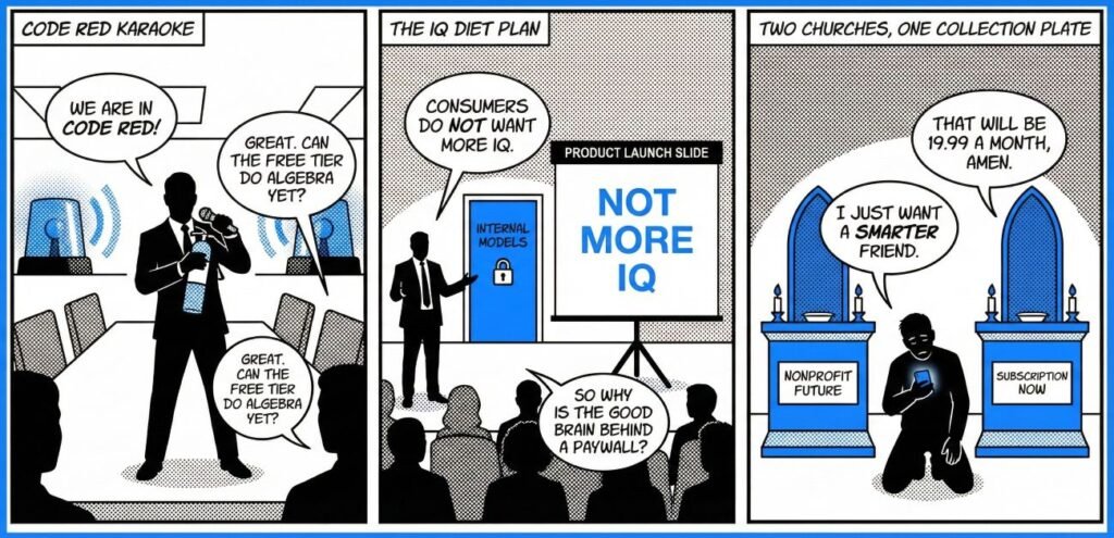 • Calling it a “race to AGI” while reassuring everyone the main consumer desire is “not more IQ” is like selling a sports car by bragging about the cup holders.
