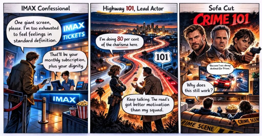 Crime 101 left me with a feel good feeling, and that is basically the whole point. Maybe it’s because the actors are around my age and the film has that quiet suggestion running underneath it that everything starts wrapping up in your 50s, like life is giving you the closing credits whether you’re ready or not. Also, the cast is stacked with people I actually like, so I went in already leaning generous. I was tired as well, and if this hadn’t been IMAX I would’ve probably skipped it entirely and kept my Monday intact. The IMAX part mattered. The music mattered even more. The score makes a big statement and it carries the action and the mood in a way that reminded me of Dune. Not because it’s the same, but because it triggered that same thought: without a genius-level soundtrack, those films lose a lot of their impact. Here, the music is doing that work, pushing scenes into your chest, telling you what to feel, and doing it well. And then there are the Highway 101 views. On IMAX, they look glorious. Proper cinema postcard stuff. That alone is worth the big screen if you’re in the mood for it. But I couldn’t shake this other feeling: I was watching a streaming movie on an IMAX screen. Not in a bad way. More like the line has blurred so much lately that a lot of streaming films are now good enough to compete with cinema releases, and this one has that exact polish and pacing. It feels designed to play just as well at home as it does in a giant auditorium. So yes, it works on IMAX and it works on a sofa, and that’s the compliment and the roast in one sentence. All in all, it’s a good film to watch big or small, but honestly, if it was only on a normal screen and I was paying a full ticket without an Unlimited subscription, I don’t think I’d have gone. This one was made for streaming, and IMAX just makes it feel like an event for people who needed a reason to leave the house.
