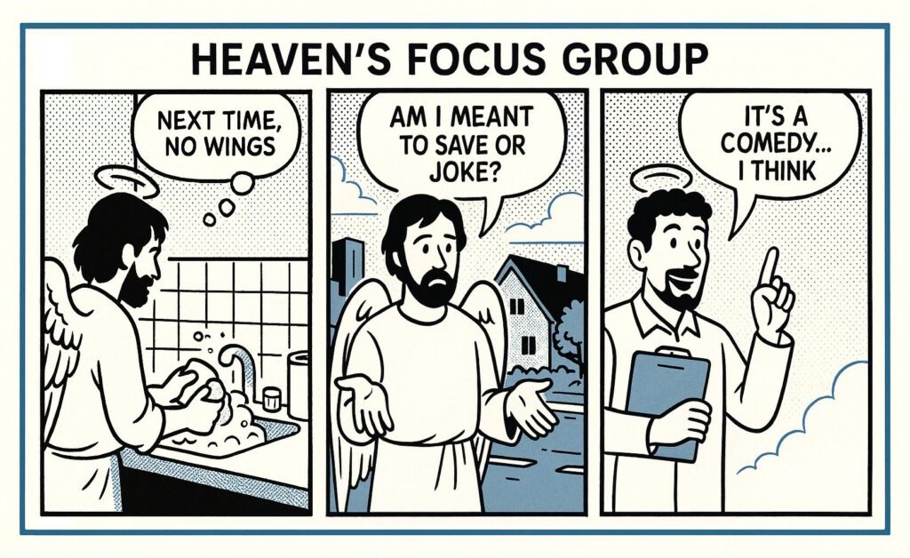 Panel 1: Angel washing mugs, halo tilted. Thought: “Next time, no wings.”
