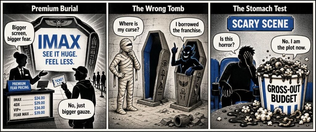 Panel description + dialogue: A huge IMAX screen shows a tiny sarcophagus while a cashier hands over a luxury-priced ticket. A viewer holds popcorn like emergency medicine.