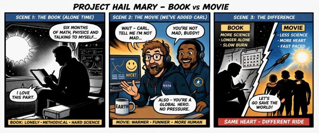 Project Hail Mary the book is more dry, methodical and properly trapped inside Ryland Grace’s head, where the science, isolation and problem-solving do most of the heavy lifting. The film keeps the same skeleton and the same heart, but smooths it into something warmer, funnier and more openly cinematic, with less of the dense hard-science detail and more emphasis on pace, emotion and the bond at the centre of the story. So the adaptation is fairly faithful where it matters, but it clearly trims the nerdier machinery of the novel to make it play better on a giant screen. In simple terms, the book feels more like a survival puzzle written by a science obsessive, while the film feels like that same puzzle repackaged as a crowd-pleasing space adventure.