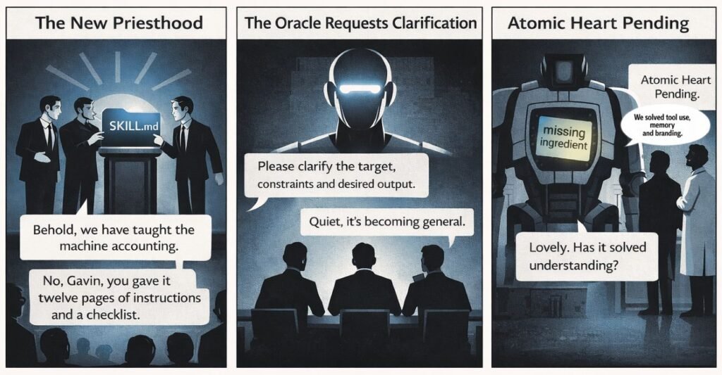 A video published about the rise of agent “skills” accidentally highlights the real joke: we are still writing laminated instructions for machines while being asked to clap for the coming of AGI.