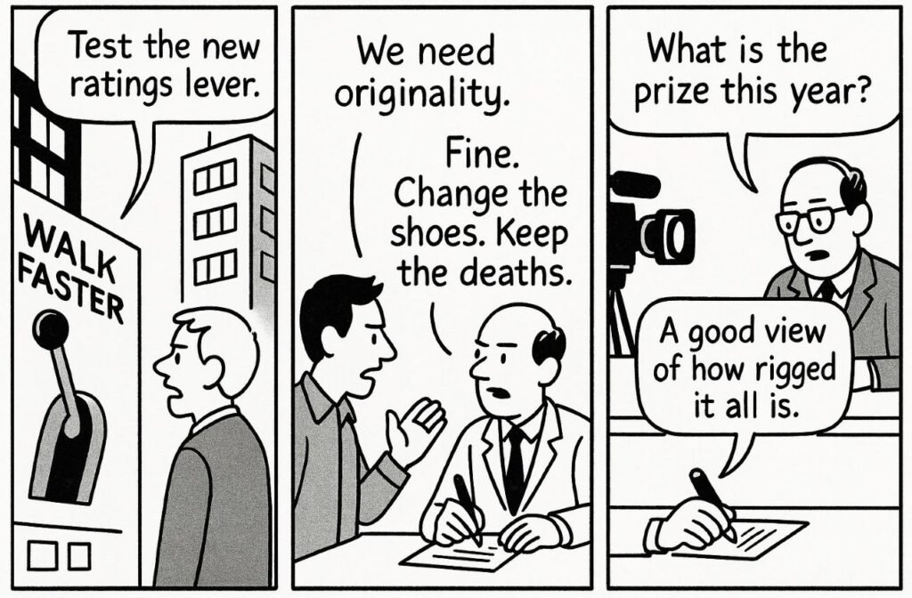 King writes worlds like a man pacing a corridor, opening new doors to the same nightmare. The costumes change. The message stays. Power loves a game it can rig. Media loves a death it can monetise. The audience loves a story that makes them feel safe by putting someone else in danger.