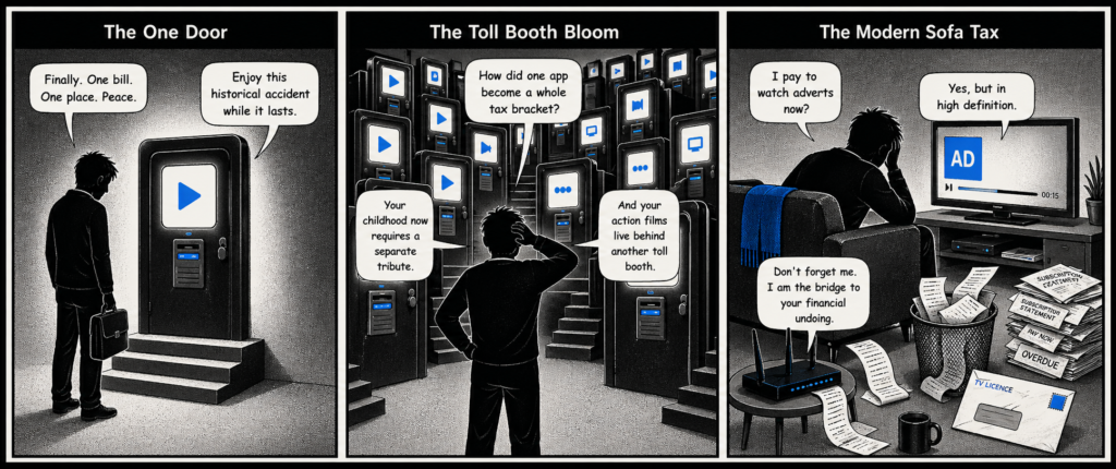 Streaming subscriptions are now too many to count with one modest salary, unless the salary has been promoted to emotional support animal. There was a time when Netflix looked like the blessed little door in the wall: films, series, big studios, one login, one bill, one sofa-shaped kingdom. Then every studio looked at that kingdom and thought, “Lovely. Let’s each build a toll booth.” So now the same entertainment cupboard has been smashed into Netflix, Disney+, Apple TV+, Paramount+, Amazon Prime Video, HBO Max, and whatever shiny app will arrive next week wearing a cape made of venture capital and cancelled shows. The joke is not only that we pay more. The joke is that we pay more to do more admin. Every month becomes a tiny household audit. Which app has the one series? Which app lost the old film? Which app now has adverts despite charging money? Which app raised its price because apparently “content investment” means the customer must adopt a billionaire’s spreadsheet like a sick Victorian orphan. And yes, if you abandon the subscription swamp and crawl back to old TV, there is still the TV licence sitting there like a ceremonial tax on owning a rectangle. Add broadband, because without internet the streaming empire is just expensive icons. Add council tax, gas, electricity, bus passes, mobile phones, cloud storage, software, and then music, where the free version often feels less like freedom and more like a radio station trapped in a vending machine. The richest companies in the world have learned the oldest trick: don’t sell ownership, sell permission. Don’t sell culture, rent access. Don’t reward artists properly, optimise the platform. Meanwhile ordinary wages shuffle behind inflation like a tired extra in scene 47, carrying a broken umbrella. Streaming did not free us from cable. It made cable modular, moodier, and better at direct debits.