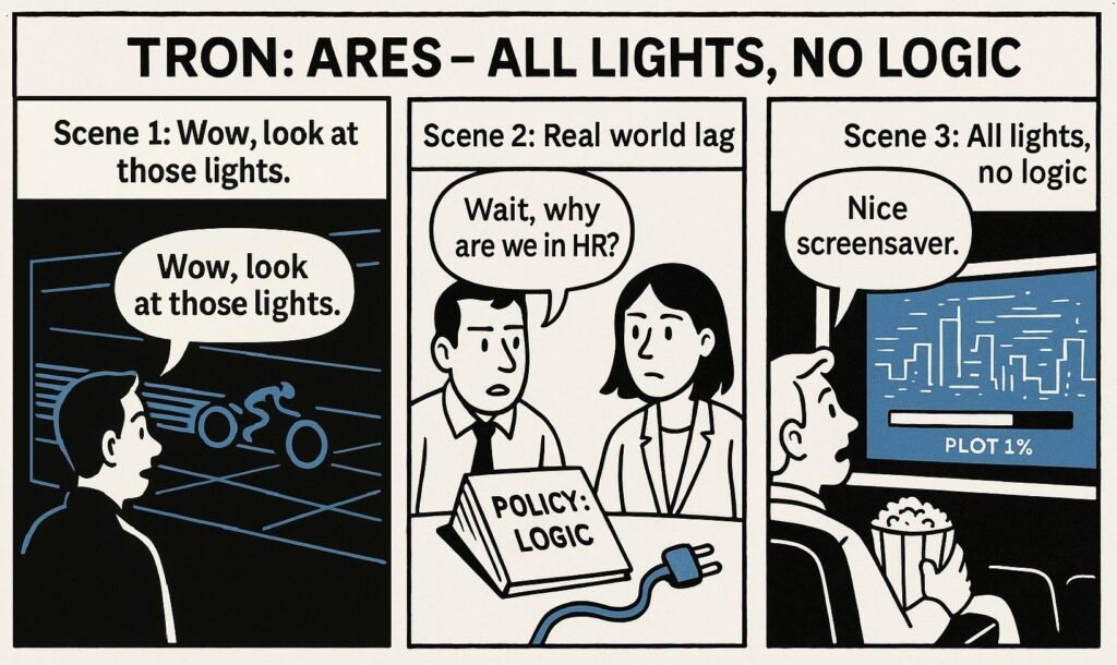 In Tron: Ares, Disney plugs back into the Grid hoping nostalgia will carry the current. A digital being named Ares crosses into the real world to “understand humanity” — though most humans watching still can’t understand the plot.