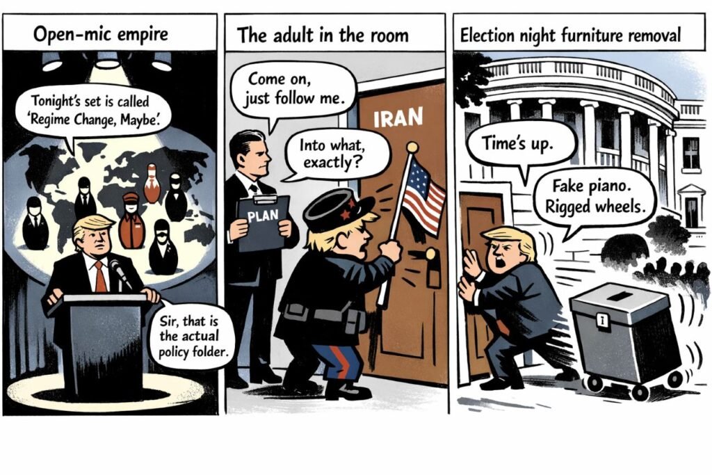 Trump: “Tonight’s set is called ‘Regime Change, Maybe’.”
