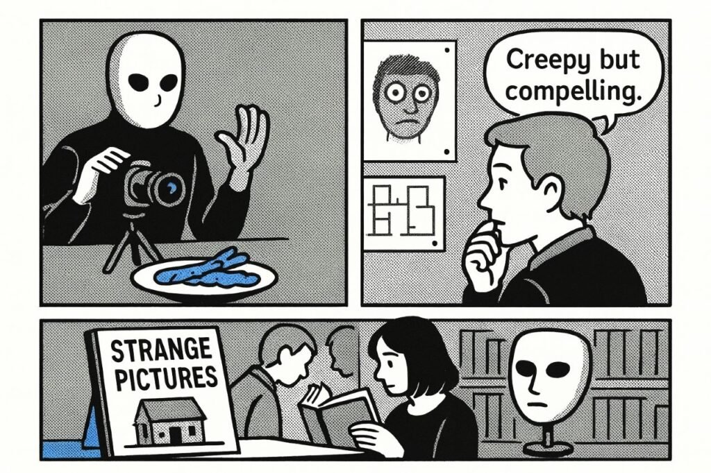 Scene 3: Bookshop display — Strange Pictures sits in translation, readers flip it, but the mask still stares back.